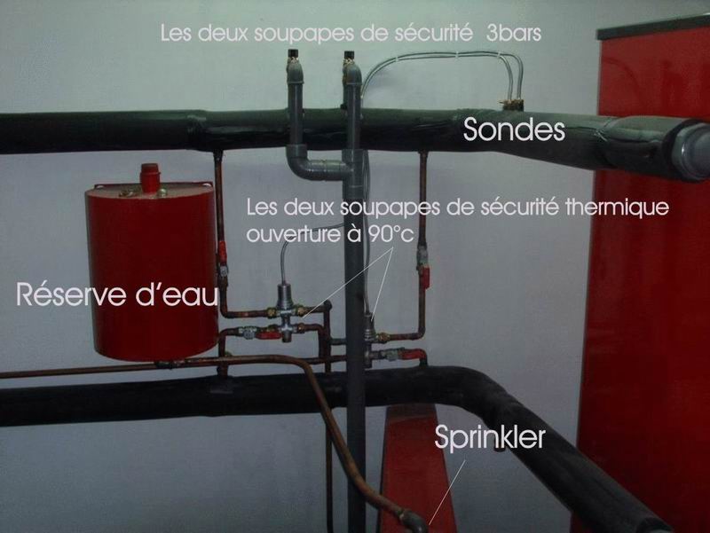 Les deux soupapes de sécurité thermique s'ouvrent automatiquement à une températures de 100°/110° .Le fonctionnement est mécanique.L'eau froide du réseau entre sur le retour, en même temps, l'équivalent d'eau est prise sur le départ et est mise à l'égout.Cela pose un problème car la chaudière s'est déjà mise en sécurité à 99° (aquastat de sécurité sur la chaudière réglé à 99°), et comme la chaudière pilote les pompes de recyclage, elle a arrêté ses fameuses pompes.Donc l'eau ne circule plus et cela prend un certain temps pour que la température se diffuse jusqu'aux deux sondes . Elles ne sont d'ailleurs pas bien placées, elles auraient du être au plus près du départ eau .La solution serait de régler l'aquastat de sécurité à 110°, mais cela me ferait perdre la garantie de la chaudière